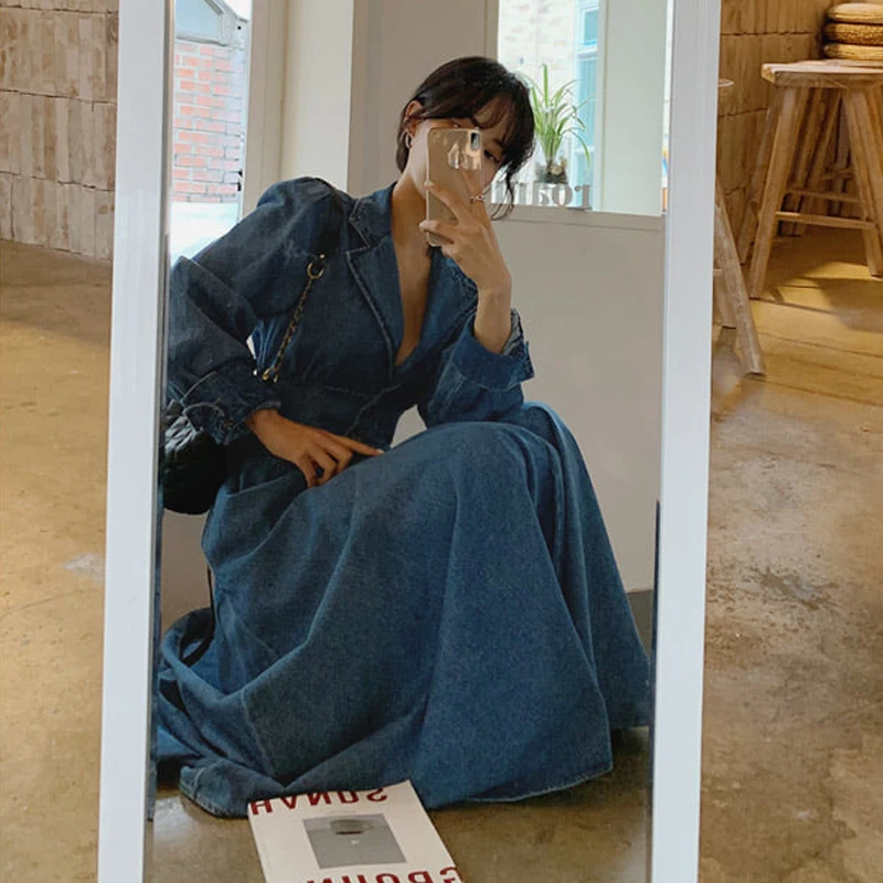Promo Free Shipping 2019 New Fashion S-L Dresses For Women Long Maxi Turn Down Collar Dresses Long Sleeve Spring Autumn Big Hem Dress