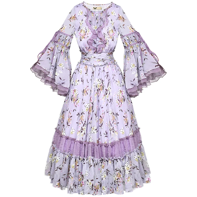 New Free Shipping 2019 New Fashion Women Chiffon Long Mid-calf Three Quater Sleeve Dresses Summer Boshow Ruffles Dress S-L Purple