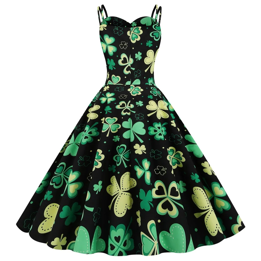 Images of Green Clover Print Summer Dress 2020 Rockabilly Vintage A-line Party Dress Prom Spaghetti Strap Swing Vestidos St.patrick's Day :