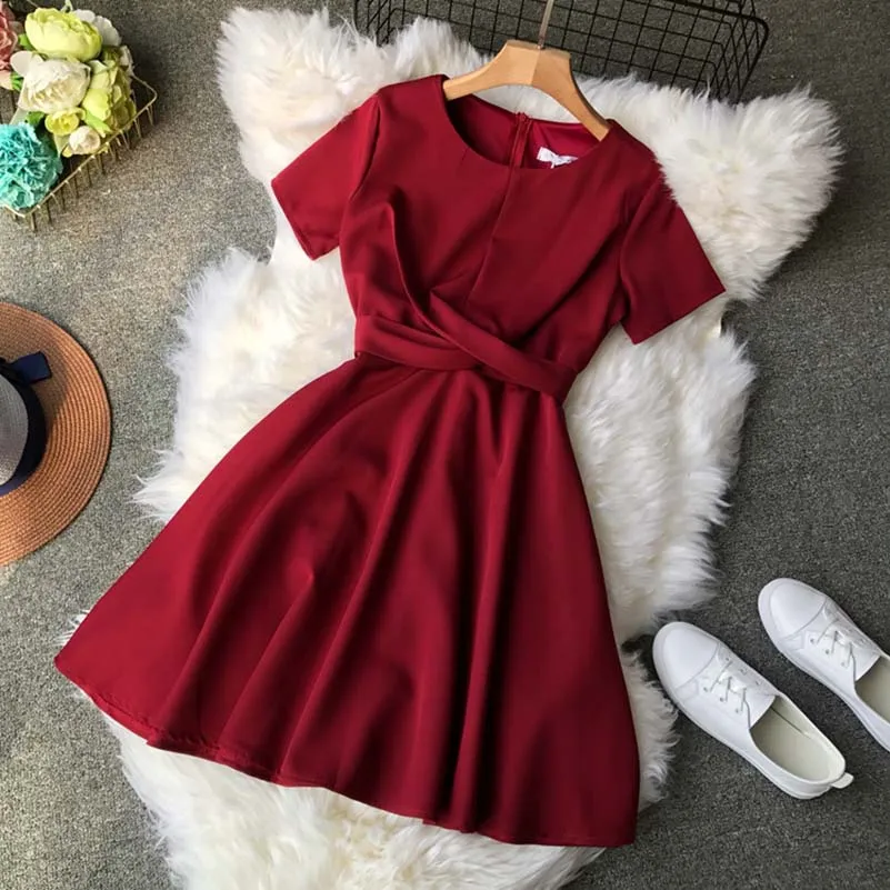 New Vintage A-line Solid Short Bow Above Knee Mini Regular Natural O-neck Summer Dress Women Vestidos Vestido Summer Dresses