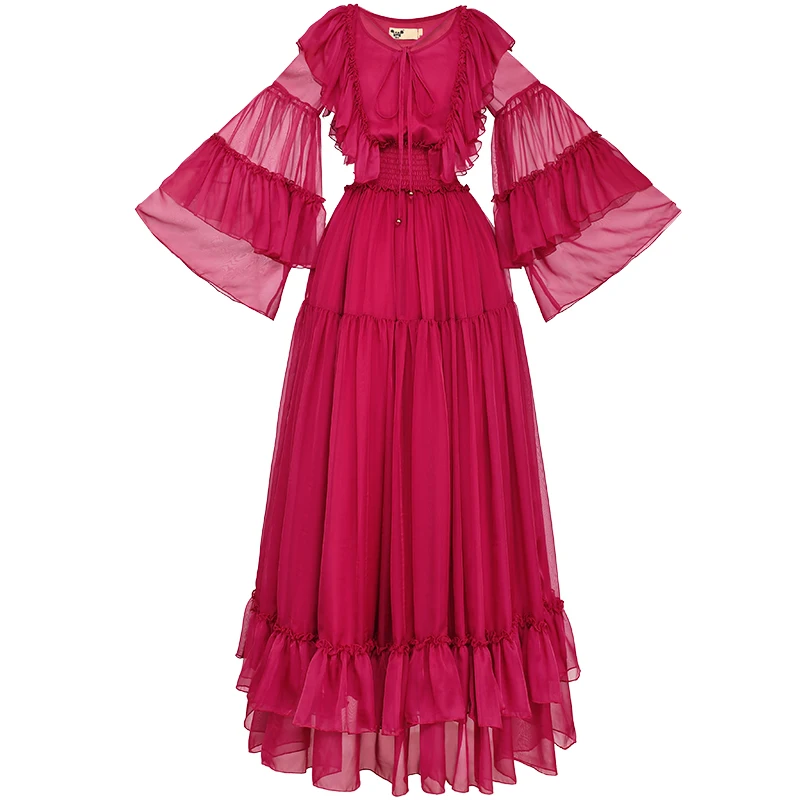 Images of Free Shiping Boshow 2019 New Fashion Women Long Maxi Flare Sleeve Dresses Spring Bohemian Chiffon S-L Ruffles Red Dresses :