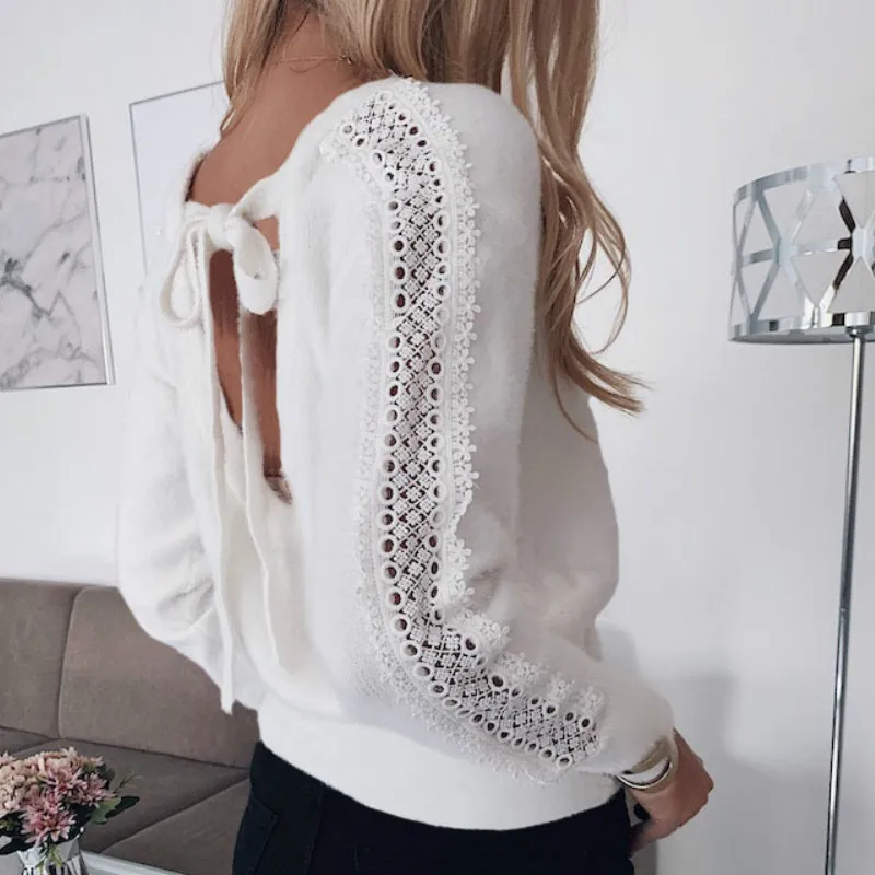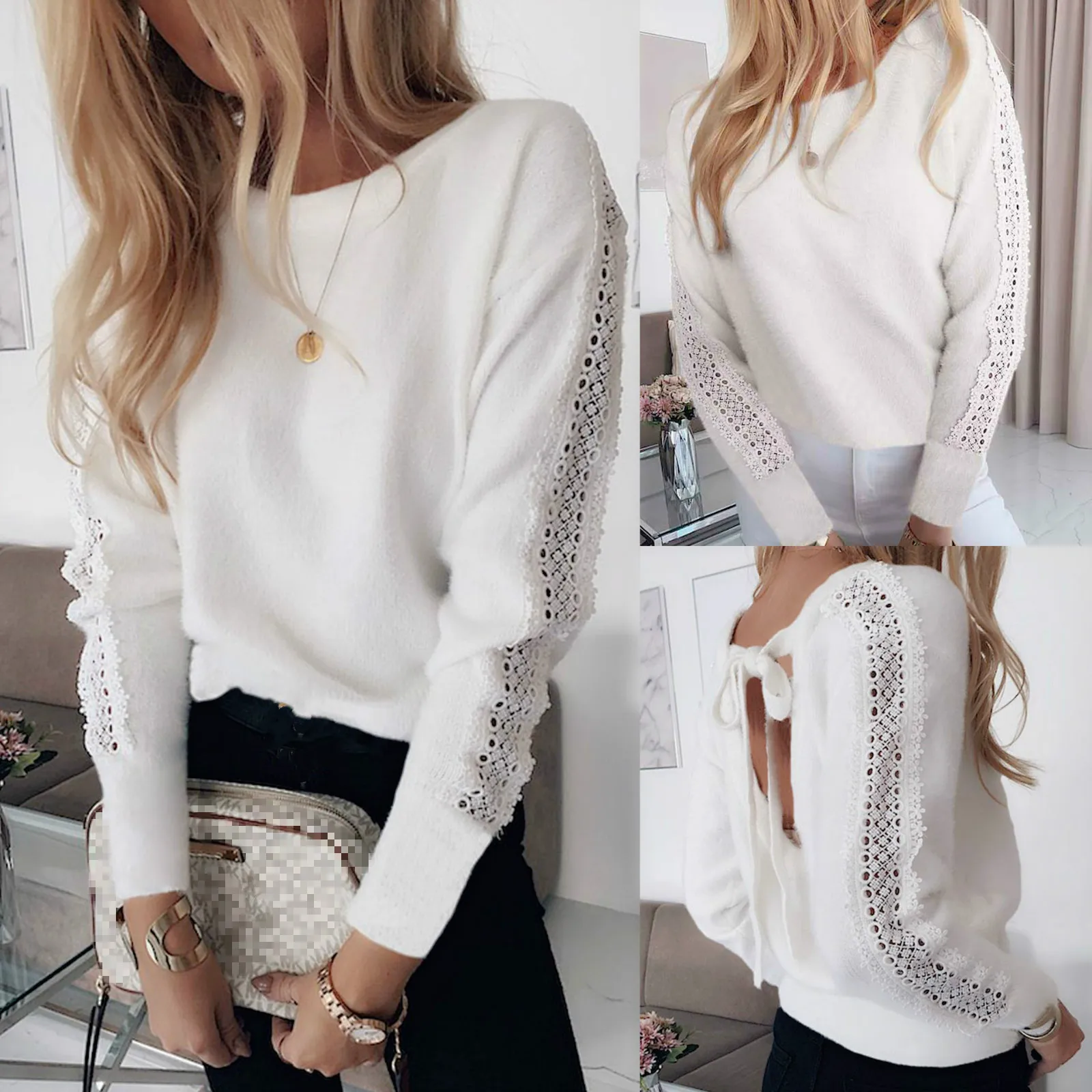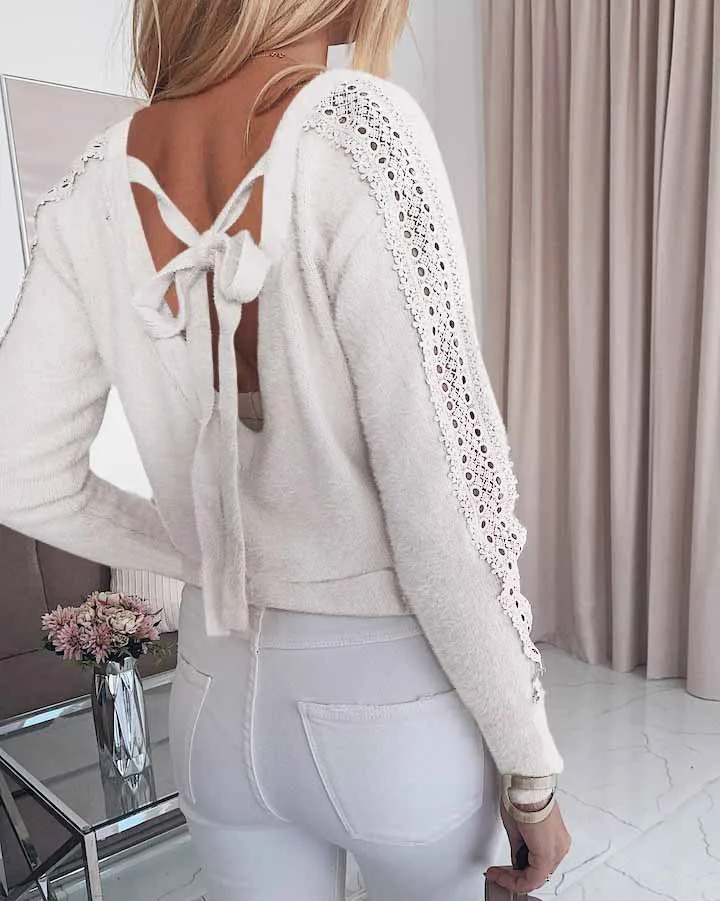 Images of Sexy Solid Color White Bow Bandage Backless Long Sleeve Hollow Out Women Blouse Sexy Tops and Shirt Long Sleeve Women Shirt :