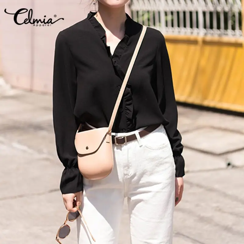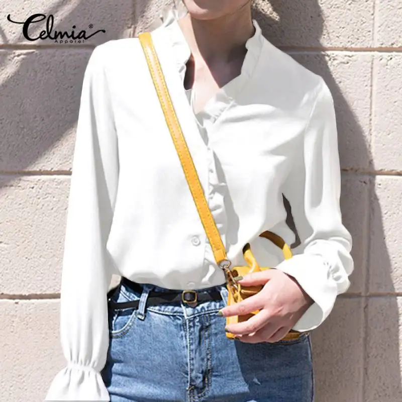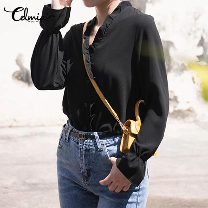 Images of Celmia Women V-neck Ruffles Tops Blouse Elegant Shirt Button Casual Loose Sexy Long Flare Sleeve Party Office Blusas Clothes 5XL :