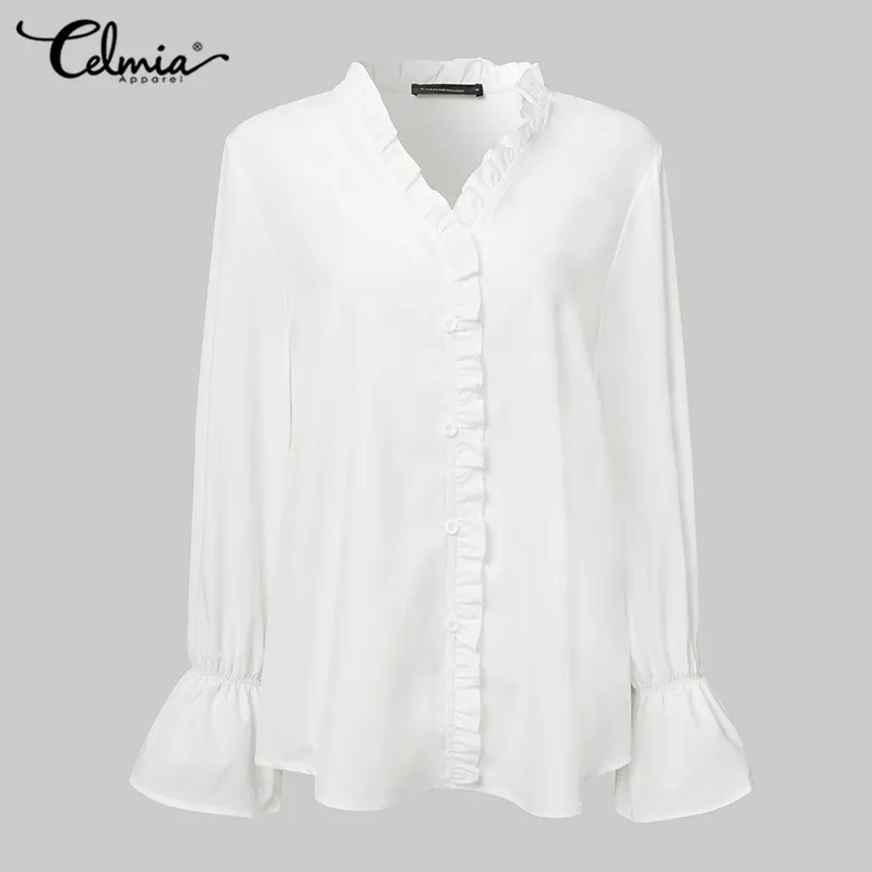 New Celmia Women V-neck Ruffles Tops Blouse Elegant Shirt Button Casual Loose Sexy Long Flare Sleeve Party Office Blusas Clothes 5XL