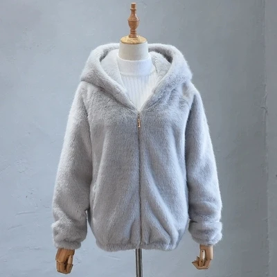 Images of Free Shipping Women Loose Mink Fur Jacket with a hood :